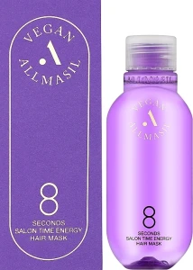 До складу енергетичної маски для волосся Allmasil 8 Seconds Salon Time Energy Hair Mask входить комплекс з пептидів, рослинних екстрактів, амінокислот, рослинних протеїнів.