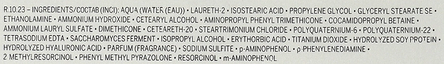 пропорція змішування: 1:1,5 (60 мл фарби на 90 мл оксиданта). Перше застосування - натуральне волосся: нанести на довжину та кінчики волосся, витримати 20 хвилин, потім нанести склад на корені та витримати ще 30 хвилин. Загальний час витримки 50 хвилин. Повторне застосування: нанести на відрослі корені на 20-25 хвилин, потім розподілити по усій довжині волосся. За необхідності залишити на 5-10 хвилин. Загальний час витримки 30 хвилин. На сивому волоссі - 40 хвилин.