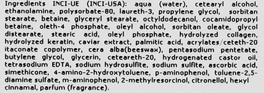 Экстракт икры делает волосы сильными и эластичными, питает пряди и кожу головы, а также улучшает приток крови к волосяным луковицам. Коллаген увлажняет и предотвращает потерю влаги. Кератин, создавая на каждом волоске невидимую пленочку, защищает локоны от разрушения. Инновационная формула обеспечивает быструю активацию и интенсивное действие в течение 12 минут, что значительно ускоряет процедуру окрашивания.