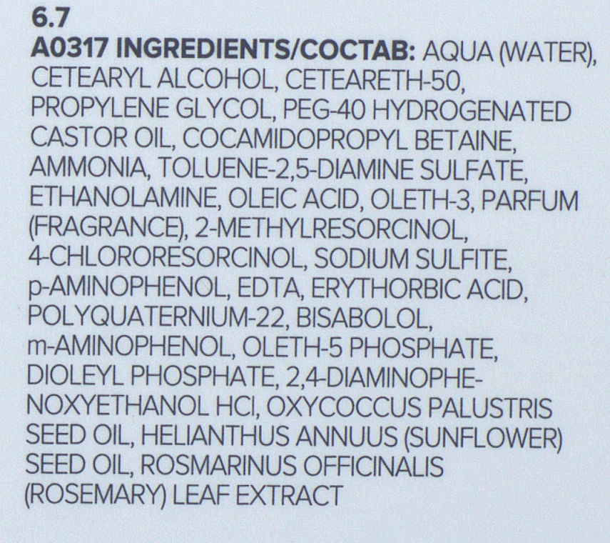 Aqua (Water), Setearyl Alcohol, Ceteareth-50, Propylene Glycol, Cocamidopropyl Betaine, Ammonia, Oleth 3, Oleic Acid, PEG-40 Hydrogenated Castor Oil, Parfum(Fragrance), Sodium Sulfite, Ethanolamine, EDTA, Erythorbic Acid, Polyquanternium-22, Bisabolol, Toluene-2,5-Diamine Sulfate, 2-Metholrecorcinol, Oleth 5-Phosphate, Dioleyl Phosphate, p-Aminophenol, Oxycoccus Palustris Seed Oil, 2,4-Diaminophenoxyethanol-HCl, Helianthus Annus (Sunflower Seed Oil), Rosmarinus Officinalis (Rosemary) Seed Oil.